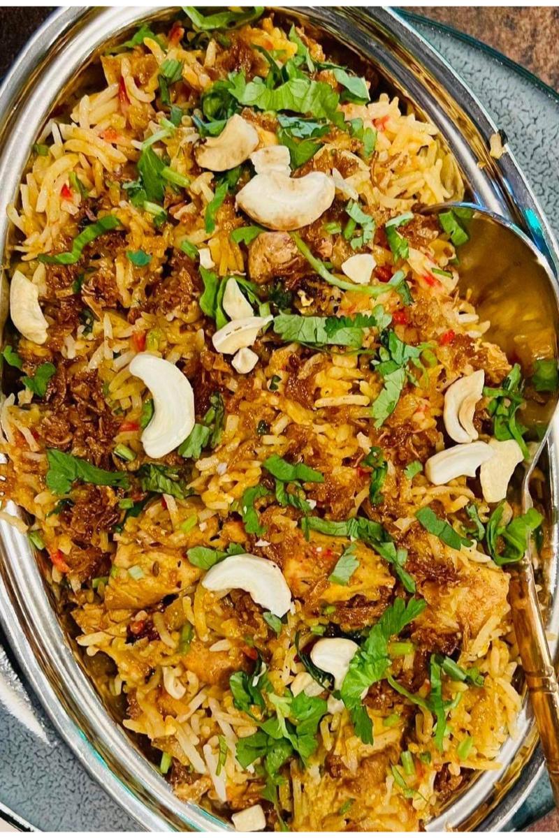 En populær indisk rett fra Hyderabad med kylling, lam eller konfereker i smørsaus og dampet saffron basmatiris. Serveres med raita og papadum