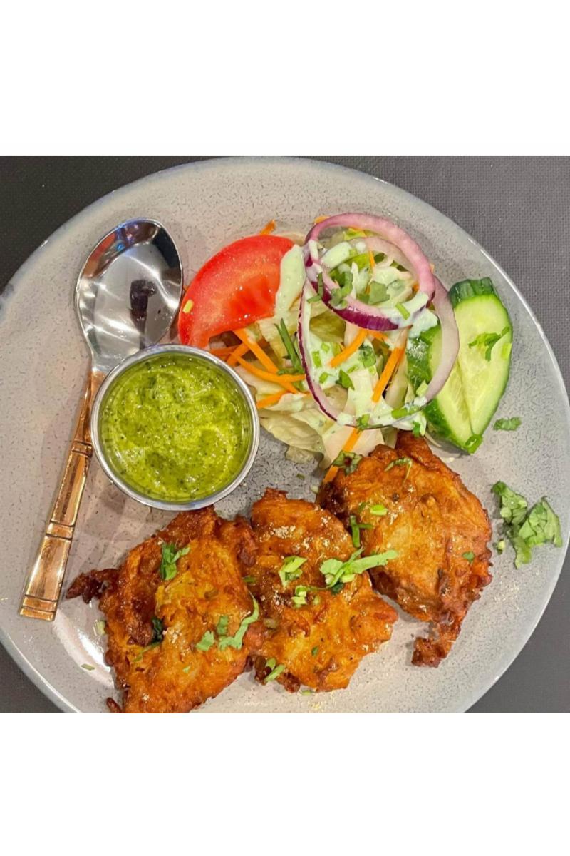 Blanding av løk og poteter dyppes i en blanding av kikert og maismel. tilsatt løpstikkefrø, chili,og gurkemeie førdet friteres. Servert med myntechutney