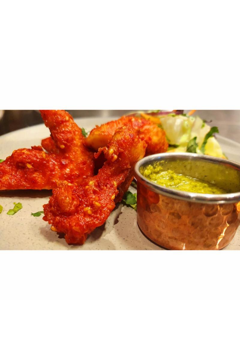 Kylling marinert med hvitløk, chili og sesamfrø med indiske krydder. Serveres med myntechutney.